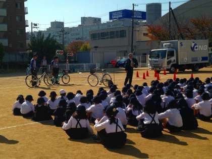 10月29日(木)に、1・2年生は交通安全指導がありました。此花警察の方と、佐川急便の方々に来ていただき、自転車は左側から乗ることや、トラックには内輪差があるので信号が赤の時には交差点の内側で待つことなどを学習しました。