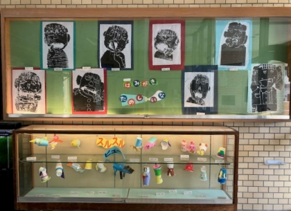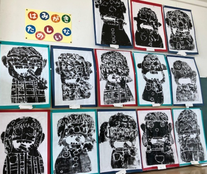 2年生の教室と玄関に、紙版画の作品があります。制作中の写真はありませんが、作品を見たら、どれだけの力作かわかります。