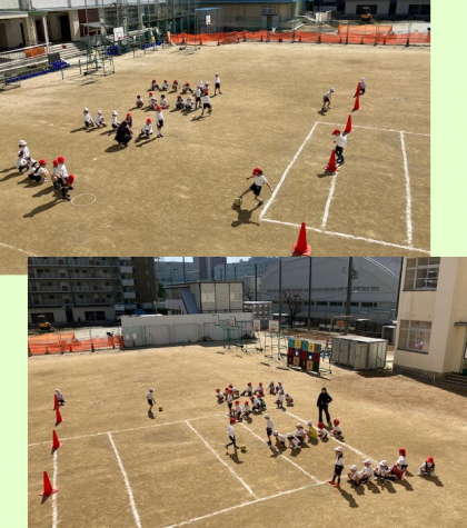 3時間目の運動場では1年1組と2組が活動していました。
