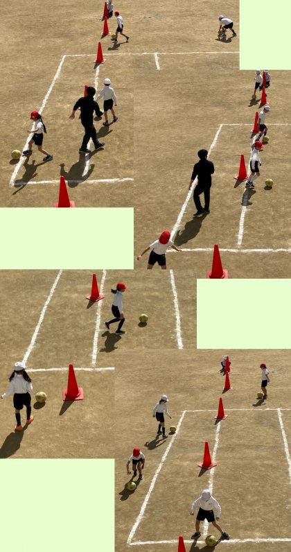 地面に描かれているコートをはさんで、向かい合わせになった子どもたちが、真ん中に置いた赤いコーンを目指してサッカーのドリブルで進んでいきます。