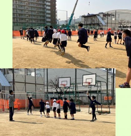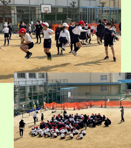 最初は戸惑っていた子どもたちでしたが、縄の端は大きく跳ばなければならないことや、回し手の工夫で跳びやすくなることが分かり、5年生も優しく2年生に気が付いたことを教えるなど、連続して跳べる回数も増えていきました。