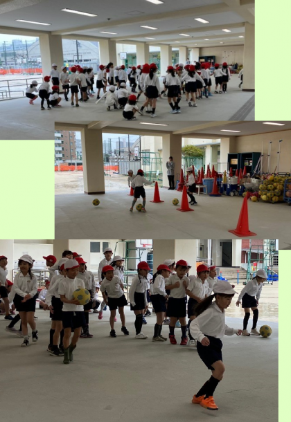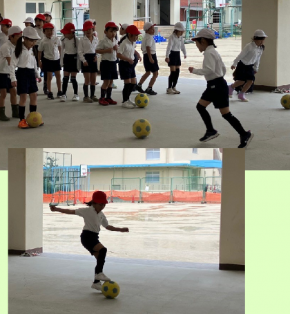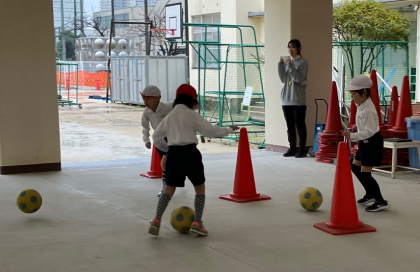 2時間目の1年1組さんと2組さんが、ボールを蹴って赤いコーンを回ってくる競争をしていました。自分の番でないときは、ひたすらお友だちを応援です。