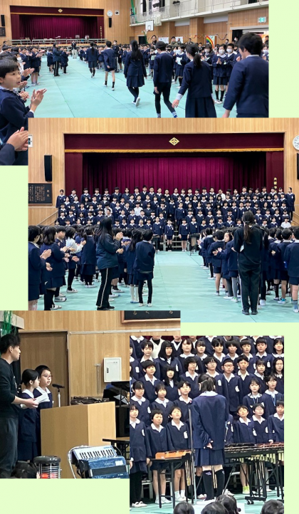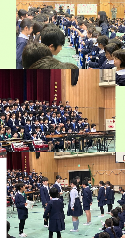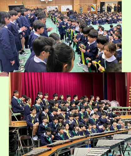 校長先生のお話のあと、1年生から、お祝いの手作りメダルを6年生へ贈りました。