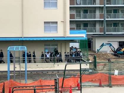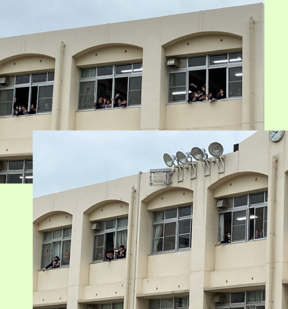 会場を先に出て教室に戻った6年生が、後から講堂を出てきた子どもたちを確認して、校舎の窓から大きな声をかけました。