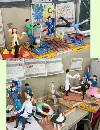 6年生の教室です。後ろの黒板前に、子どもたちが作った様々な人型の模型が置かれています。