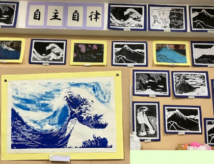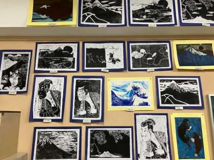 5年1組の教室です。後ろの壁には、先日仕上がった版画作品が掲示されています。一つ一つの作品を見ると、とても丁寧に彫ったのだろうと思われる仕上がり具合です。