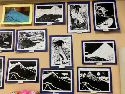 富士山の作品だけでなく、海の波や人物など、有名な作品の模写のようですが、黒いインクだけでなくカラー刷りの作品もあり、チャレンジ精神に感心します。