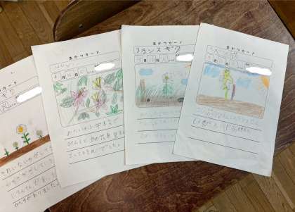 島屋小学校のいろいろなところで花や虫の観察する2年生。