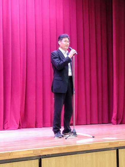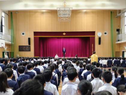 1年生から6年生まで、真剣な表情でお話を聞く姿がありました。