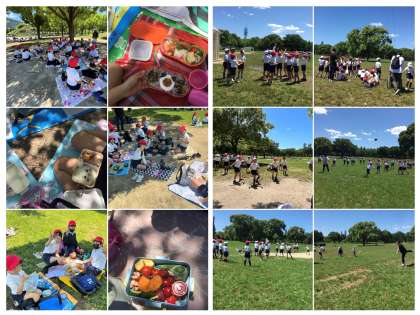 鶴見緑地の広場では,おいしいお弁当とおかしを食べた後に全力で遊びました。