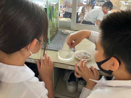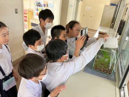 写真は、メダカの卵を観察する様子と水槽にメダカを放流する様子です。