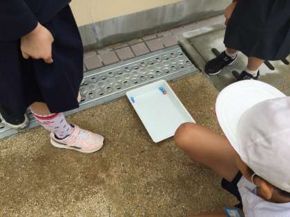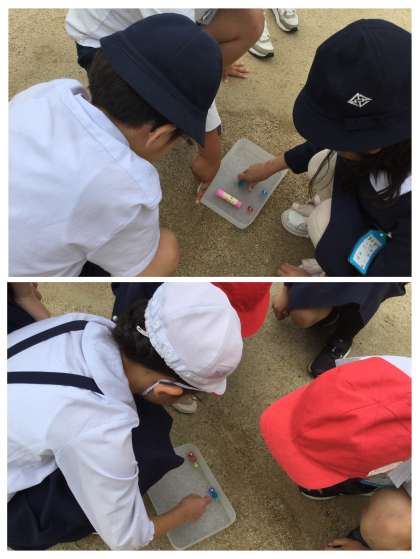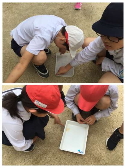 ビー玉を入れたバットを水たまりや水の流れがあるところに置いて,水の流れと地面のかたむきの関係を調べてみると,地面の高いところから低いところへと水は流れていて,平らに見える運動場でも,排水溝に向かってわずかなかたむきがあるということがわかりました。