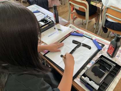 書写の学習では、姿勢(ペタ・ピン・トン)・筆の名まえ・持ち方・書き方・始筆・終筆など覚えることはいっぱいありましたが、真剣に取り組めました。