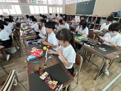 図画工作科では、お菓子や食品のそと袋を使い「フェアリー」を作りました。カニの形をしたフェアリー・人型のフェアリー・カエルの形のフェアリー・小人のフェアリー・・・