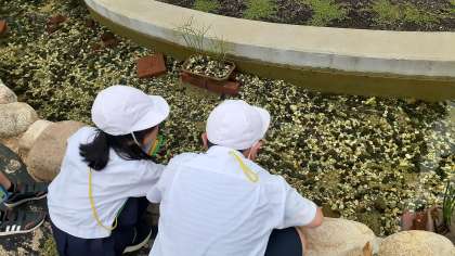中には校内で飼われているメダカやカメを観察する子もいました。