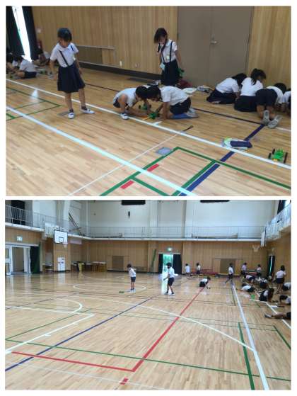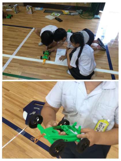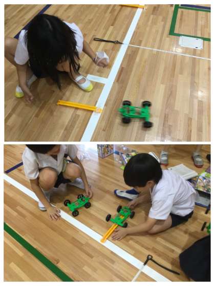 「そうか!!」と子どもたちはたちまち自分の車のゴムを付け替え,どうしたら一番遠くまで走るのか,試行錯誤タイム。考えた方法で車から手を離すと,ビューン!と走り出す車に大歓声が上がっていました。