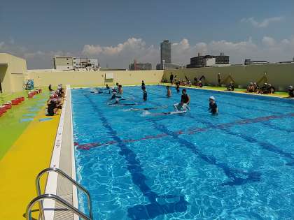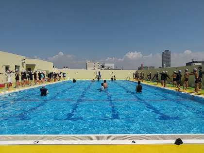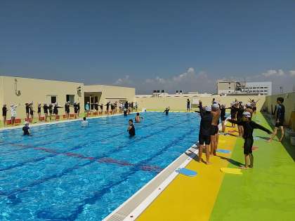 陸上大会練習に続き、水泳教室も行っています。クロールの練習をたくさんの先生方と取り組んでいます。