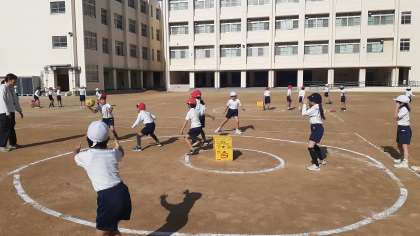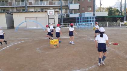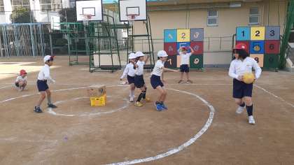 2年生、今月の外体育はボールを使った運動を行っています。