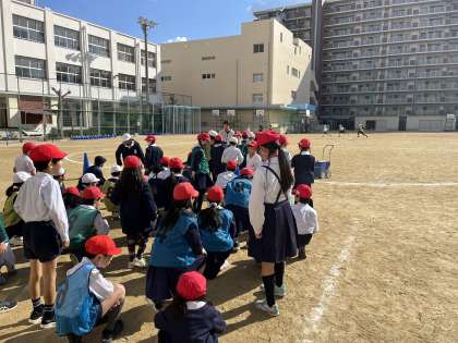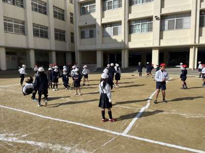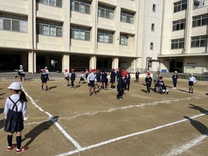 そのあと「ドッヂビー」をしました。2年生・4年生混合での赤組対白組では、4年生が2年生にフリスビーを譲ったり、声を掛け合いながら、楽しく交流することができました。