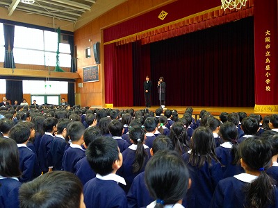 始業式では、校長先生のお話、校歌の斉唱などがあり、子どもたちは立派な態度で式に臨みました。式の後、4年4組担任の岸上先生の産休に伴い、3学期から島屋小学校に来られた阿部京子先生の紹介がありました。