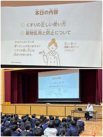 薬剤師の先生に来ていただき、薬の正しい使い方と薬物乱用について教えていただきました。