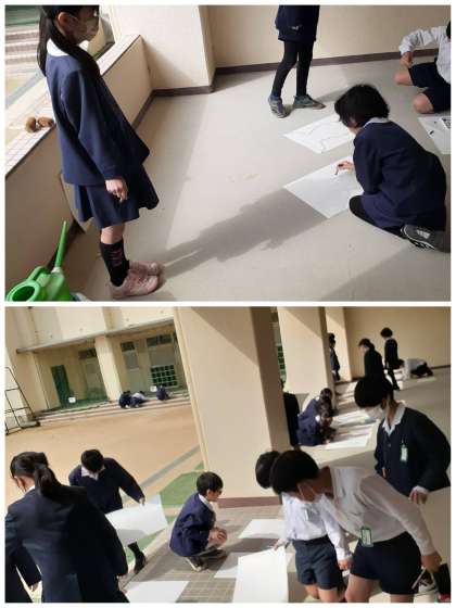 図画工作科の授業開きでは、友だちの影を紙にうつしました。