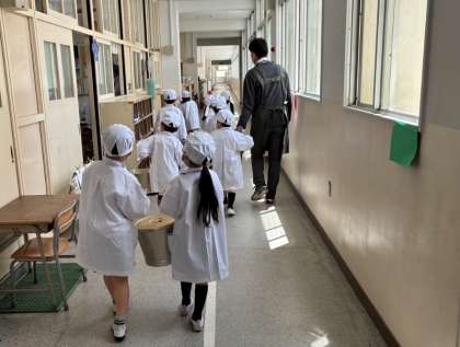 4月までは、6年生のお兄さん、お姉さんに手伝ってもらっていました。今では、並んで、運んで、配膳して・・・自分たちの力だけで準備する姿に成長を感じました。