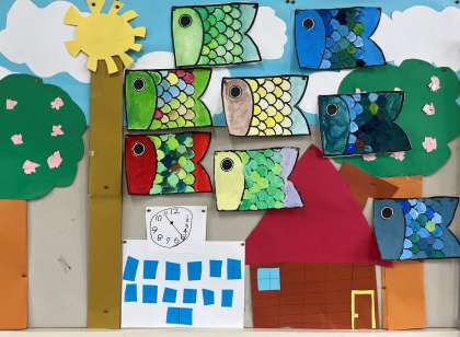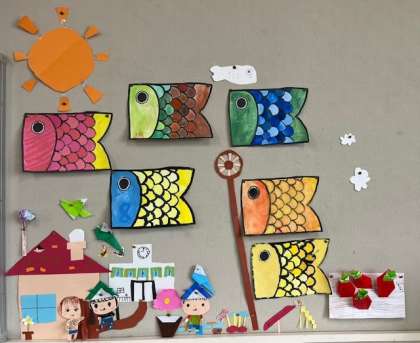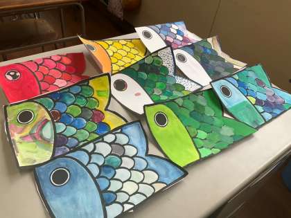 子どもたちがそれぞれ自分なりの色のテーマを決めて、うろこを1枚ずつ、色を変えながら丁寧に塗りました。