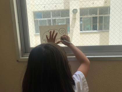 カメレオンの形を作った後、学校の廊下に貼る予定の場所を観察し、背景と同じような色に塗って『まぎれるカメレオン』を表現しました!