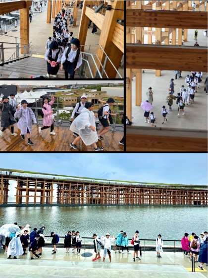 大屋根リングからの景色は圧巻で、雨の中でも子どもたちの歩みは軽いものでした。