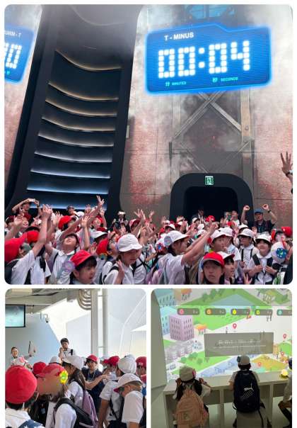 アメリカ館では、名所の紹介や宇宙旅行の大迫力の映像に、大盛り上がりでした。パビリオンの館長さんやガイドの方とも英語で交流ができて、よい経験になりました。