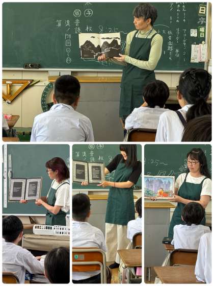 1枚目は図書ボランティア(よむよむ)の方の絵本の読み聞かせの様子です。「視点を変えて楽しむ」「構成を工夫して興味をひく」「世界の異文化を知る」、3冊の絵本を紹介していただきました。子どもたちは、絵本の世界にどっぷり浸り、充実したひとときとなりました。