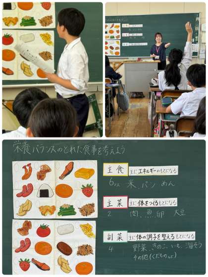 2枚目は栄養指導です。他校から栄養教諭に来ていただき、お弁当の中身を考える学習でした。主食・主菜・副菜、どのように選ぶのか。学習した後の振り返りで、初めに自分が選んだお弁当の中身に「栄養が偏っているな」と、楽しそうにしながらも新しい気付きをたくさん得た時間となりました。