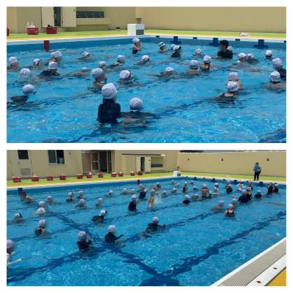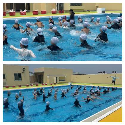 右の写真は、しぶきをあげる「お相撲さん」と、水の中で体を動かす練習をしているところです。