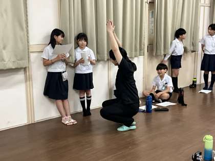最初は緊張で声も小さく、体も小さく動かしている児童が多かったですが、最後の発表時には、漫才の途中で周りを走ったり、床に寝転んで動いたり体を大きく動かしてみんなを笑わせることができていました。