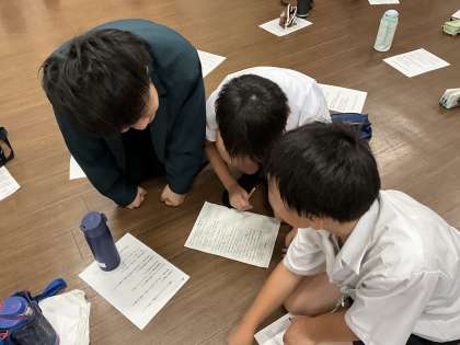 その後、コンビを組んで練習し、漫才の方に見てもらってボケやツッコミの台詞を考えました。アドバイスをもらう姿は真剣そのもの!!『面白いものを作ろう!』という心意気が垣間見えました。