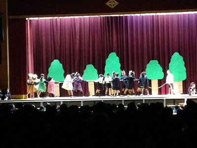1年生は、劇「おそろし山の まものたち」を演じました。1年生なりの動作の工夫やセリフの言い方の工夫が見られ、長い劇でしたがみんなしっかりとセリフを覚えていましたので、鑑賞に来られた保護者の皆さんも感心していました。見ている他学年の子どもたちは、オニとタヌキが綱引きをする場面や、ウサギが川を飛び越えていく場面が特に印象的だったようです。