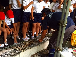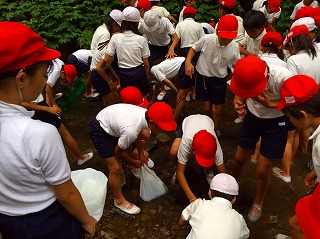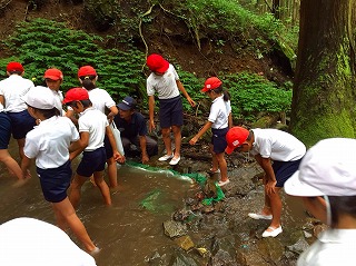 5年生の子どもたちは、ハチ高原に到着し、天気は晴れたり曇ったりです。宿舎につくと昼食後、昨年は5回やり直しをした避難訓練を2回でクリアしました。その後、「魚つかみ」をしました。冷たい水に「キャーキャー」と歓声をあげて、楽しんでいましたが、魚を捕まえるのには苦労していました。捕まえた魚をその場で焼いてもらい、おいしくいただきました。