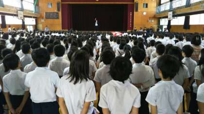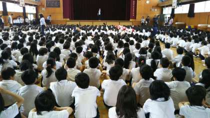 笑顔で、「ほっぺたに、たこ焼きを作るような表情で。」「縦に並べた指2本が、入るぐらいの口の大きさで。」と教えていただくと、声の響きがとてもよくなりました。島屋小学校の子どもたちの歌声は、とても素晴らしいので、みなさんに聞いていただける機会を増やしたいと考えています。
