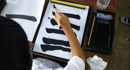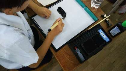 最初のお手本は、漢字の「一」です。初めて使う、硯や墨、毛筆の筆などに少し緊張しながら取り組んでいました。