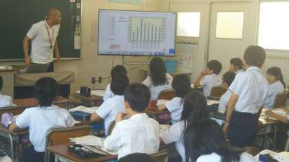 学習の様子を見てみると、先生が提示したグラフなどの資料から、気付いたことや疑問に思ったことを発表し、みんなが出し合った意見をまとめ、ノートに書いていました。