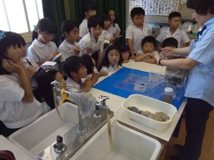 先週の26日(金)にサントリーから講師の方が来られて、水についての授業をしてくださいました。社会科の「わたしたちのくらしとみず」の単元で,暮らしの中で使う水について学習している子どもたちにとっては,興味関心の高い授業内容だったのではないかと思います。