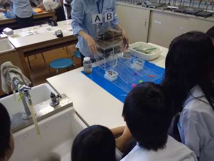 理科室で実験のような授業で,子どもたちも楽しく学習していました。森が水を貯え,きれいにしてくれていることを学びました。AとBの2種類の土に泥水をかけて,泥水がきれいになる工程を見学しました。