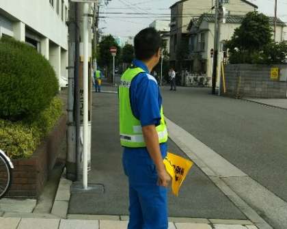 写真上:会社近くの通学路で、見守りをしていただいている社員の方