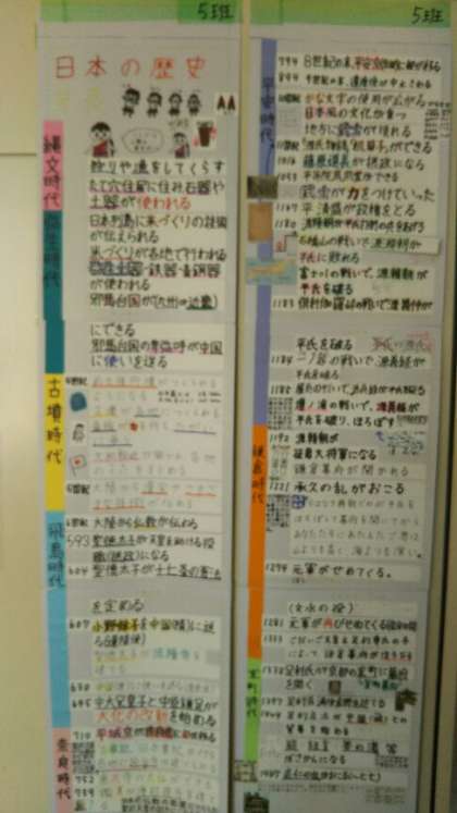 これまで学習した時代について、班で年表にまとめたり、パソコンを使って新聞にまとめたりして、より理解が深まるようにしています。