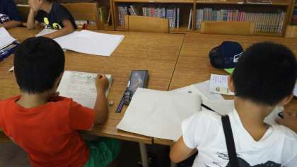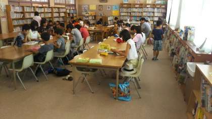図書室は、好きな本を手に取り、静かに読書している子、夏休みの課題を持参し、黙々と取り組んでいる子たちでいっぱいになっています。