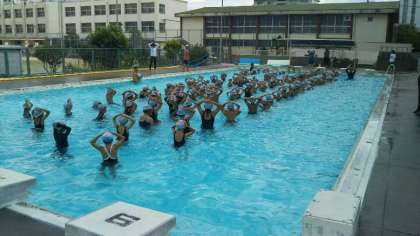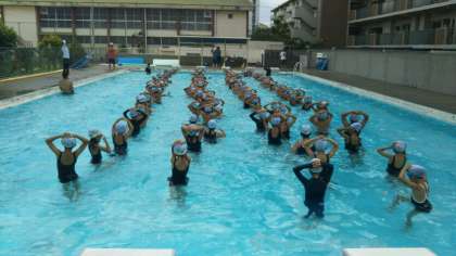 ※写真は、中学年(34年生)のプール開放の様子です。準備運動は、プールサイドでは、場所が狭すぎるので運動場でしています。(写真上)