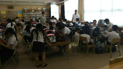 まず、放送の指示に従い、分団別に決められた場所に集合しました。そして、台風が近づいていて、集団下校しなければならないとき、どんなことに気をつけるかを話し合いました。また、帰宅後、安全のためにどのようにしなければいけないか、担当の先生からお話を聞きました。