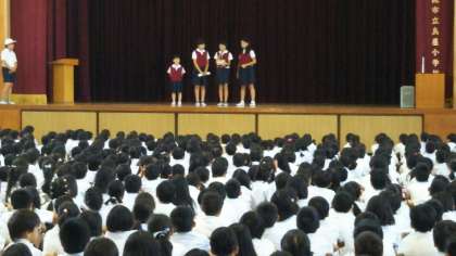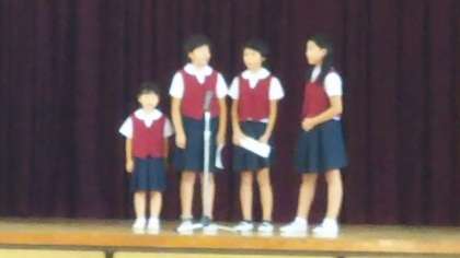 児童集会で発表する曲の一部を歌ってくれました。全校児童が美しい歌声に聞き入り、歌い終わると大きな拍手でたたえていました。