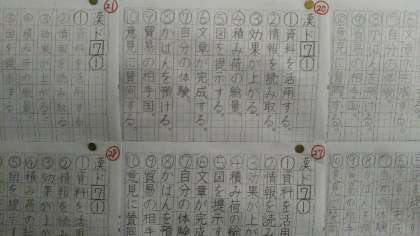 5年生が、「漢字ドリル選手権」の取組をしています。丁寧に書くのはもちろん、漢字ドリルのお手本に忠実に書き写すようにします。お手本を集中してしっかり見て、漢字を写すことで、自分の文字のくせを直し正しく覚える効果をねらっています。